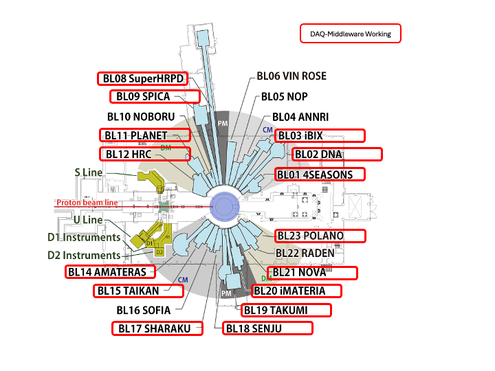 MLFには中性子のビームラインと、ミュオンのビームラインがあります。 ミュオンビームラインでもDAQ-Middlewareは使われています。
